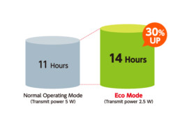 De IC-M25EURO EVO biedt tot 14 uur* gebruik in de energiebesparende Eco-modus. Door het zendvermogen te verlagen tot 2,5 W, neemt de gebruiksduur met ongeveer 30% toe in vergelijking met de standaarduitvoer van 5 W. Deze lange batterijduur maakt het apparaat ideaal voor avonturen.